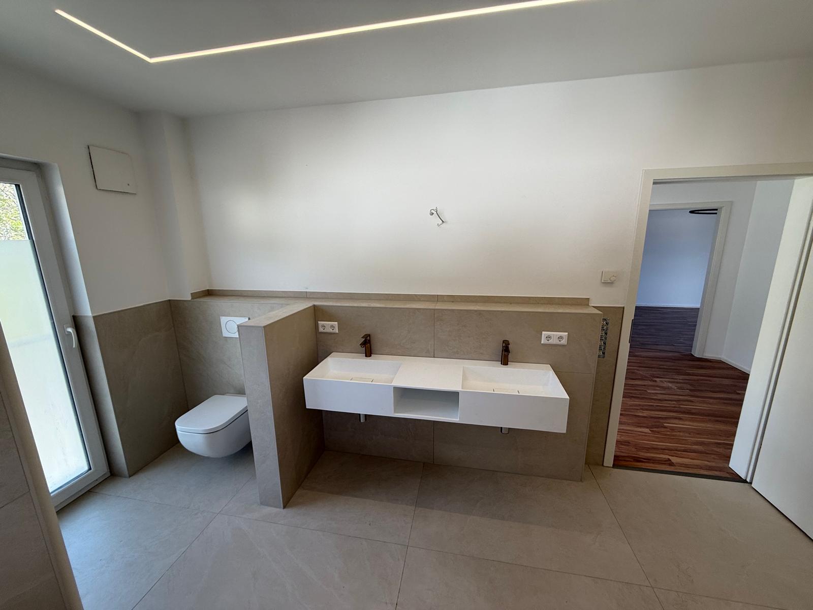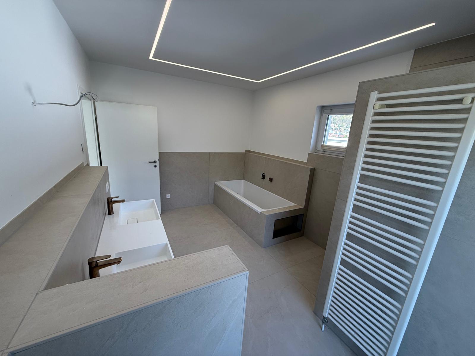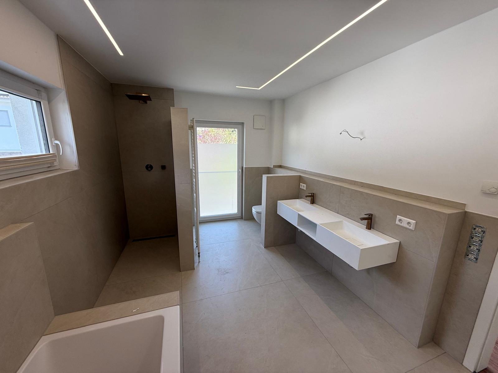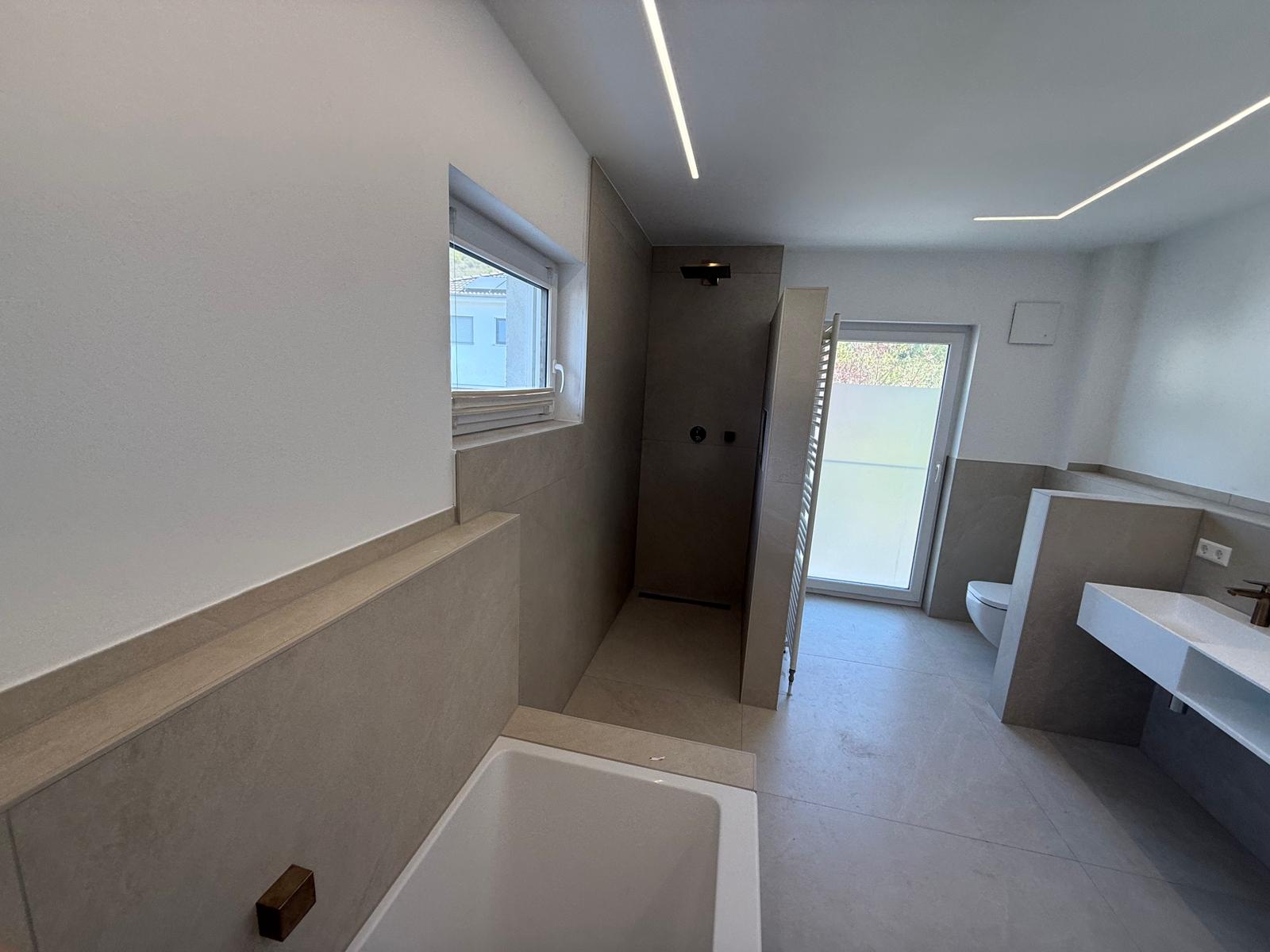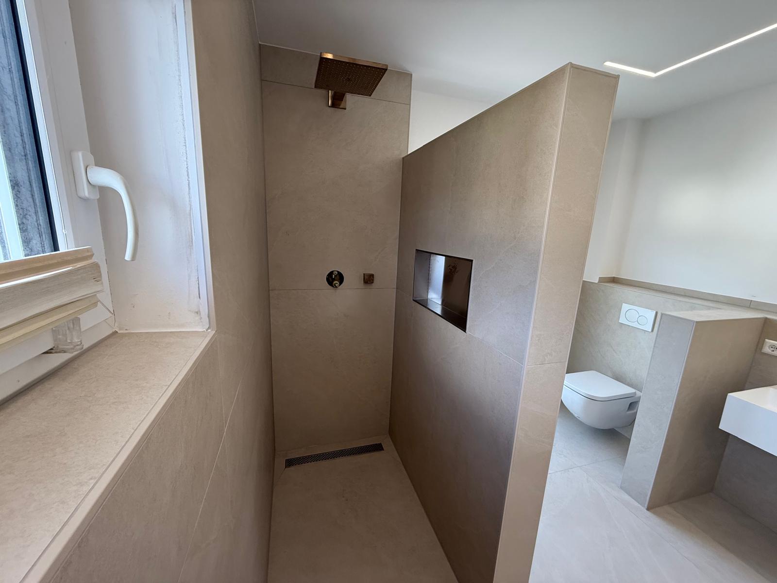 Elegante Badezimmergestaltung mit begehbarer Dusche und hochwertigen Fliesen.