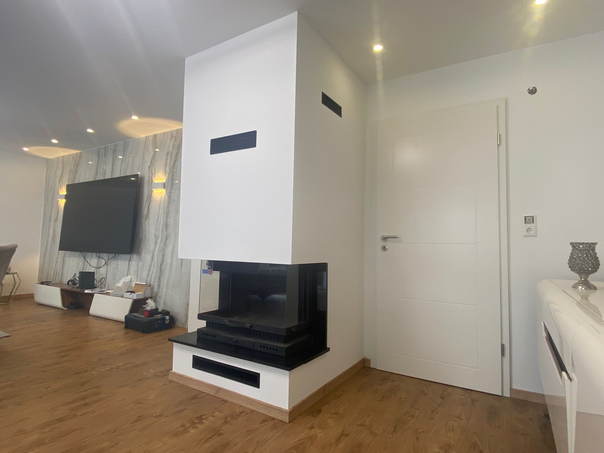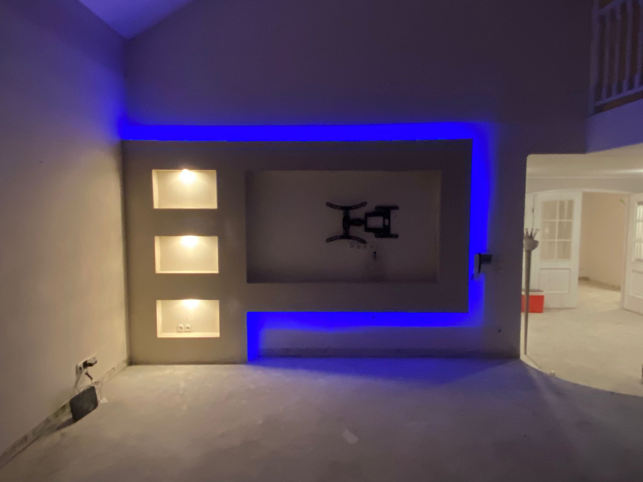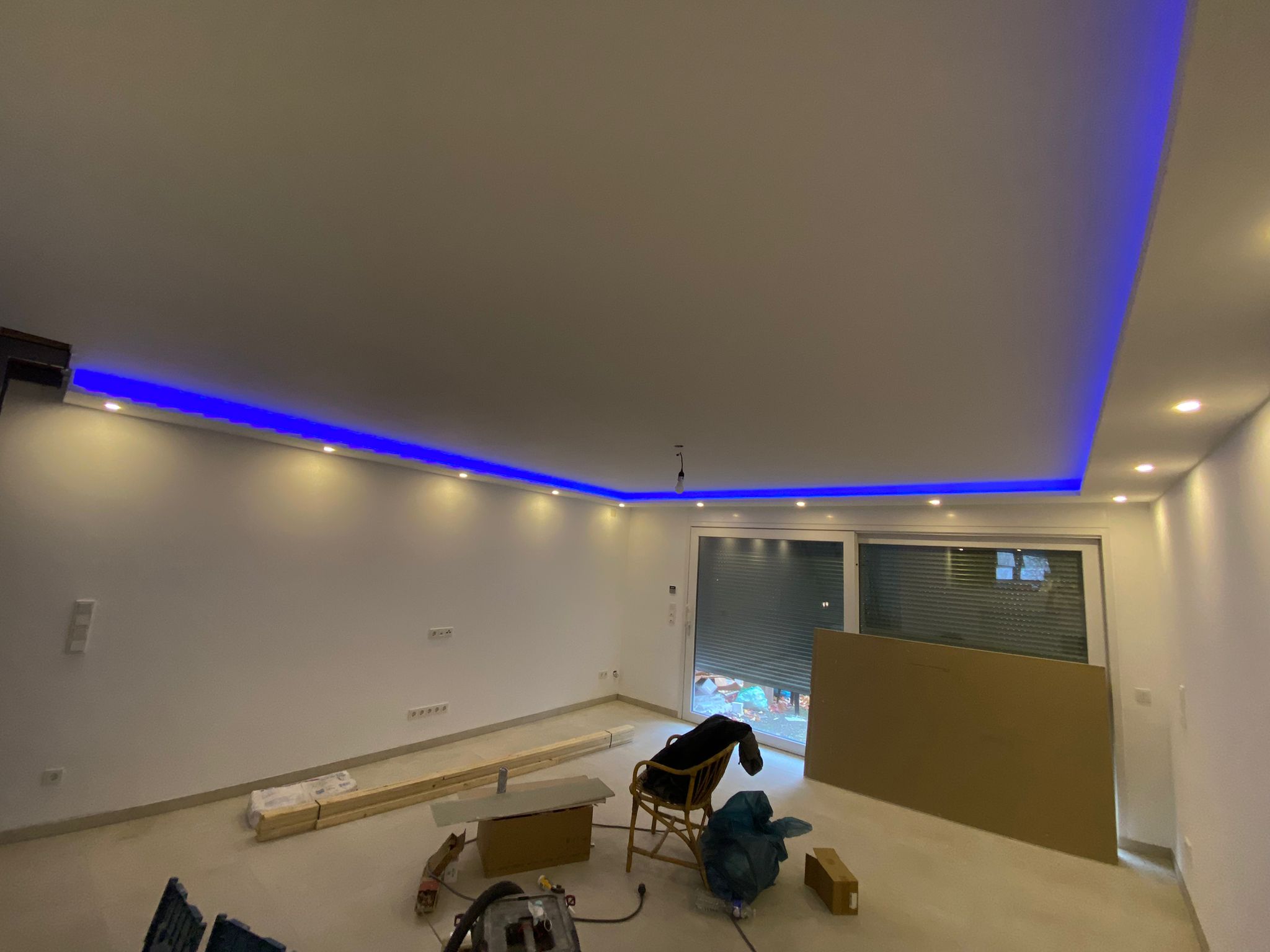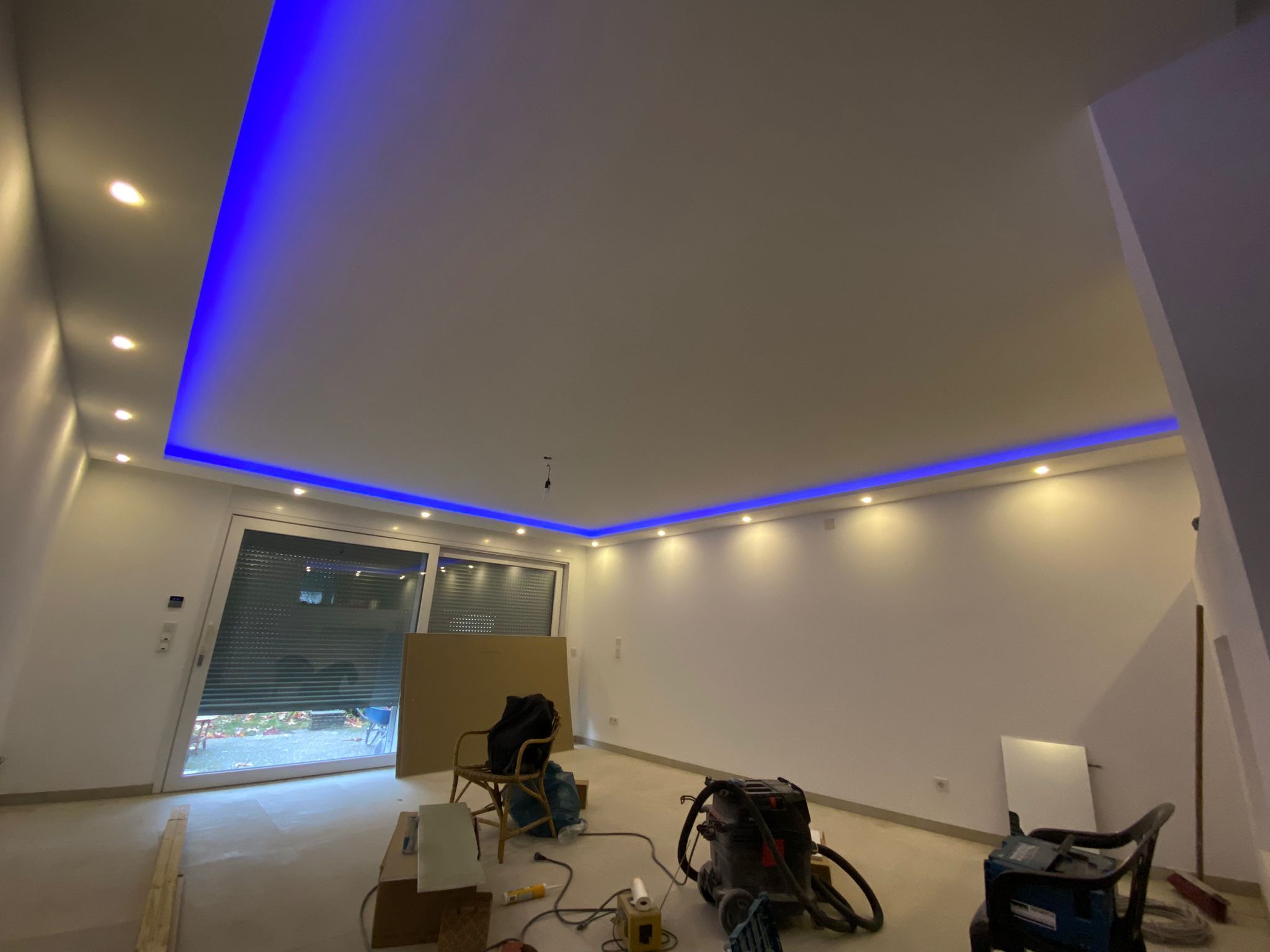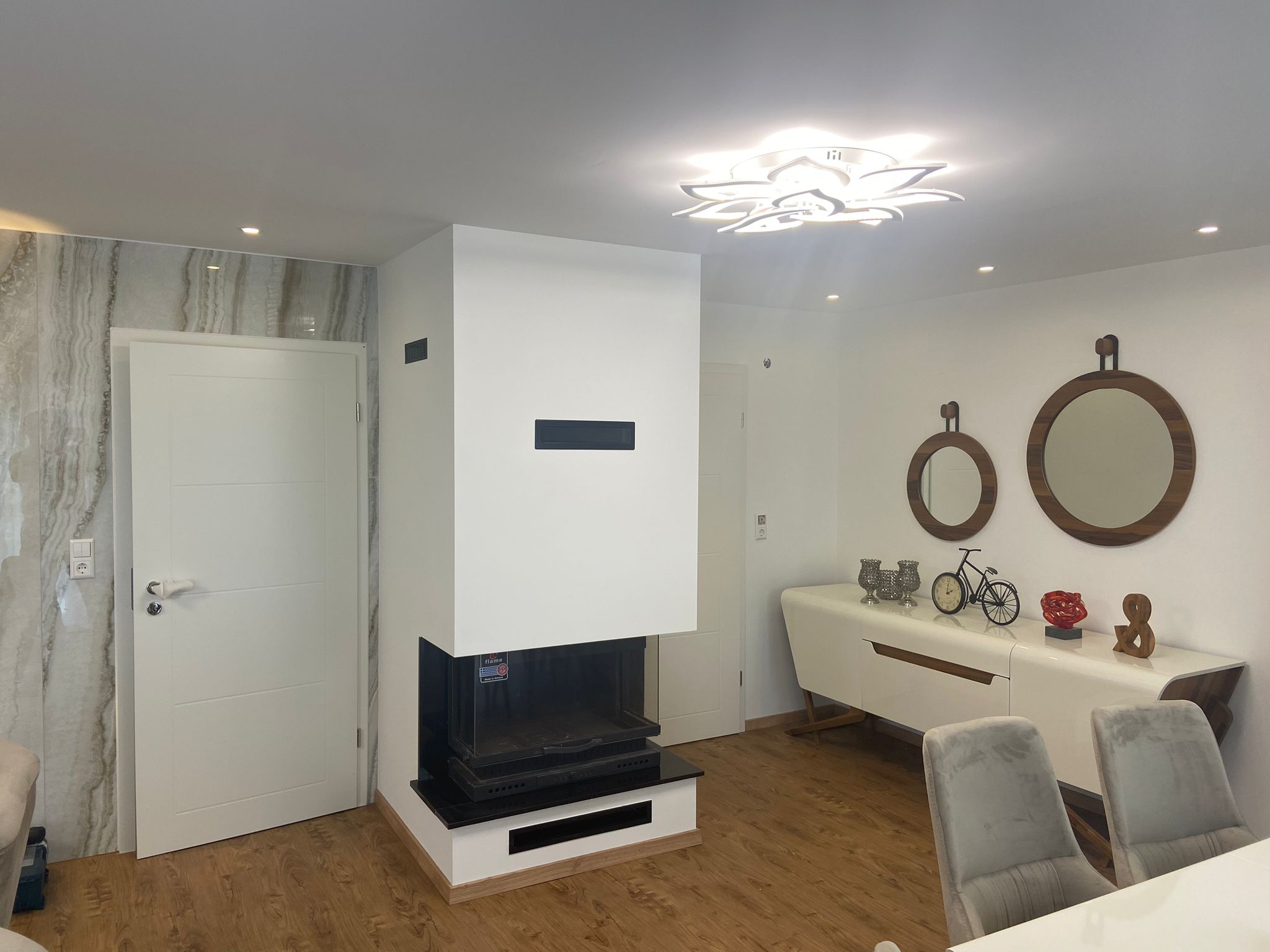 Offene Wohnraumgestaltung mit neuen Wandverkleidungen und Beleuchtungskonzept.